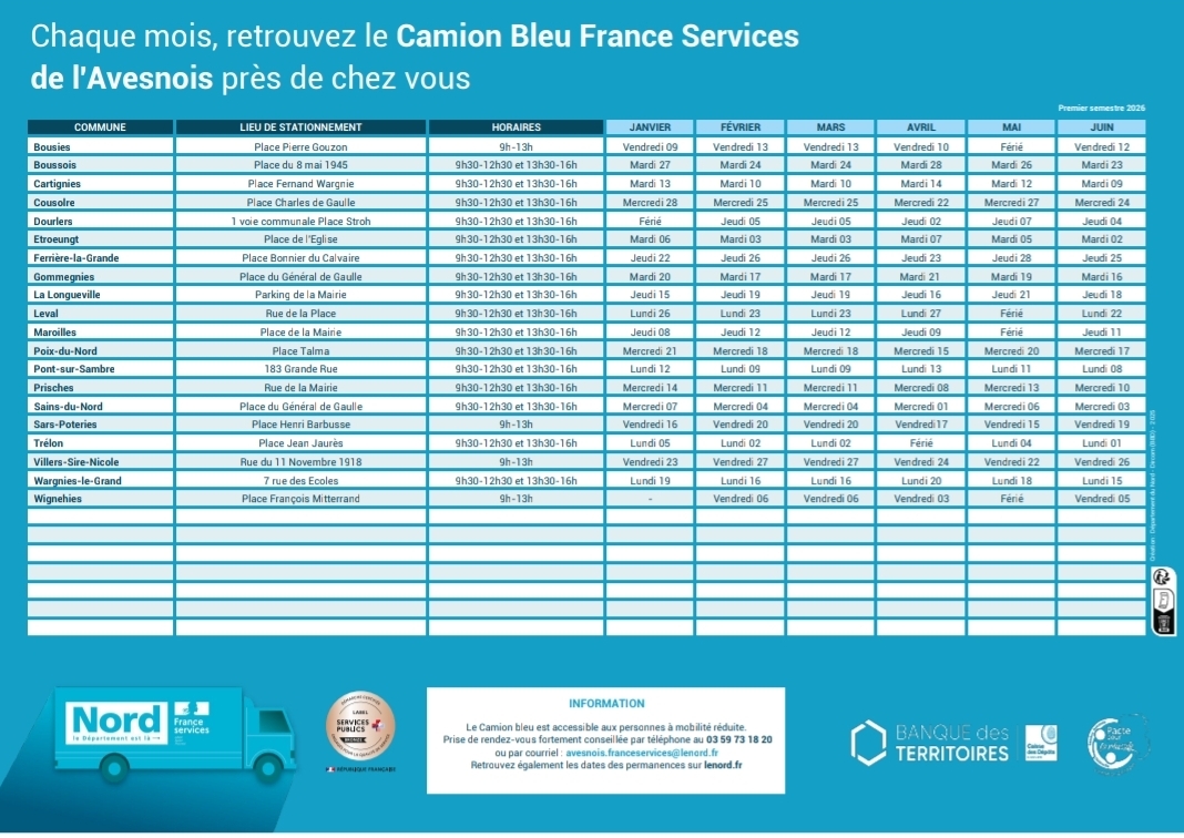 Le Camion bleu France Services va à la rencontre des habitants du Douaisis pour leur proposer un service de proximité et les accompagner pour de nombreuses formalités à accomplir (Pole Emploi, CAF, CPAM, CARSAT, etc.).