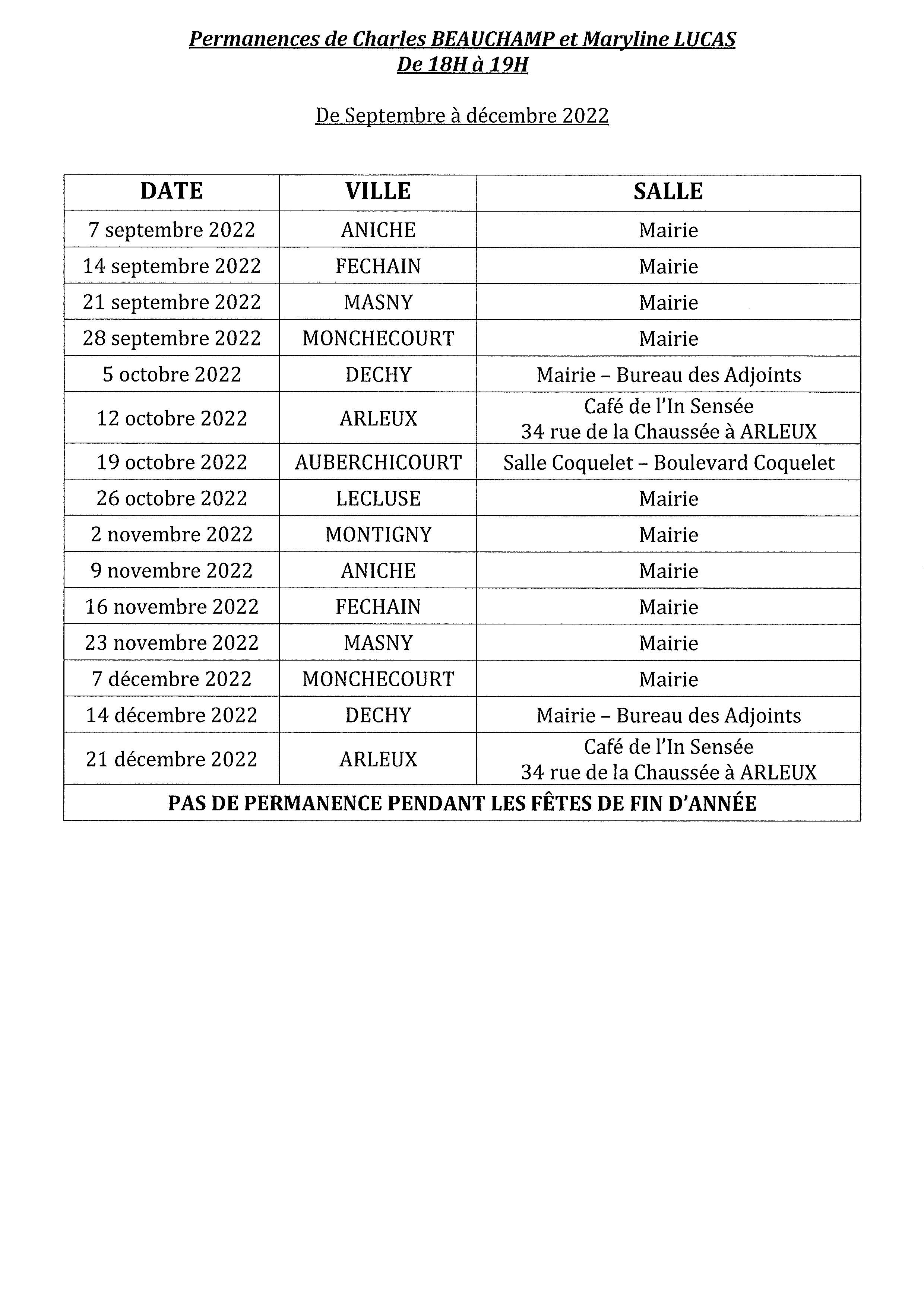 CALENDRIER PERMANENCES CHARLES BEAUCHAMP ET MARYLINE LUCAS DU 09-2022 12-2022
